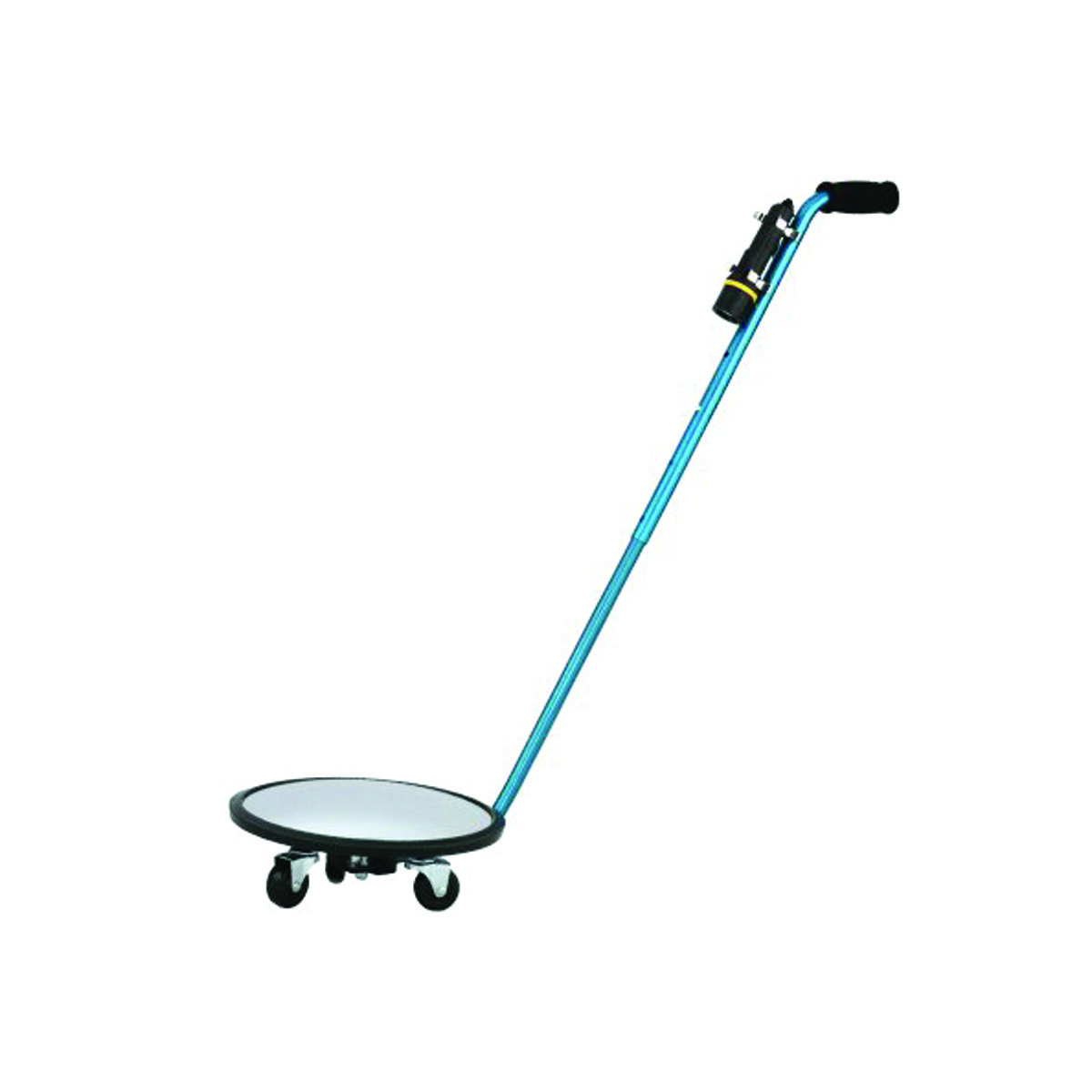 Miroir d'inspection pour véhicules de forme ronde avec une lampe. Il est fourni avec un chariot à trois roulettes. Il peut se démonter facilement pour le stockage et le transport dans un véhicule. Idéal pour inspecter le dessous des semi remorques ou des wagons de trains.