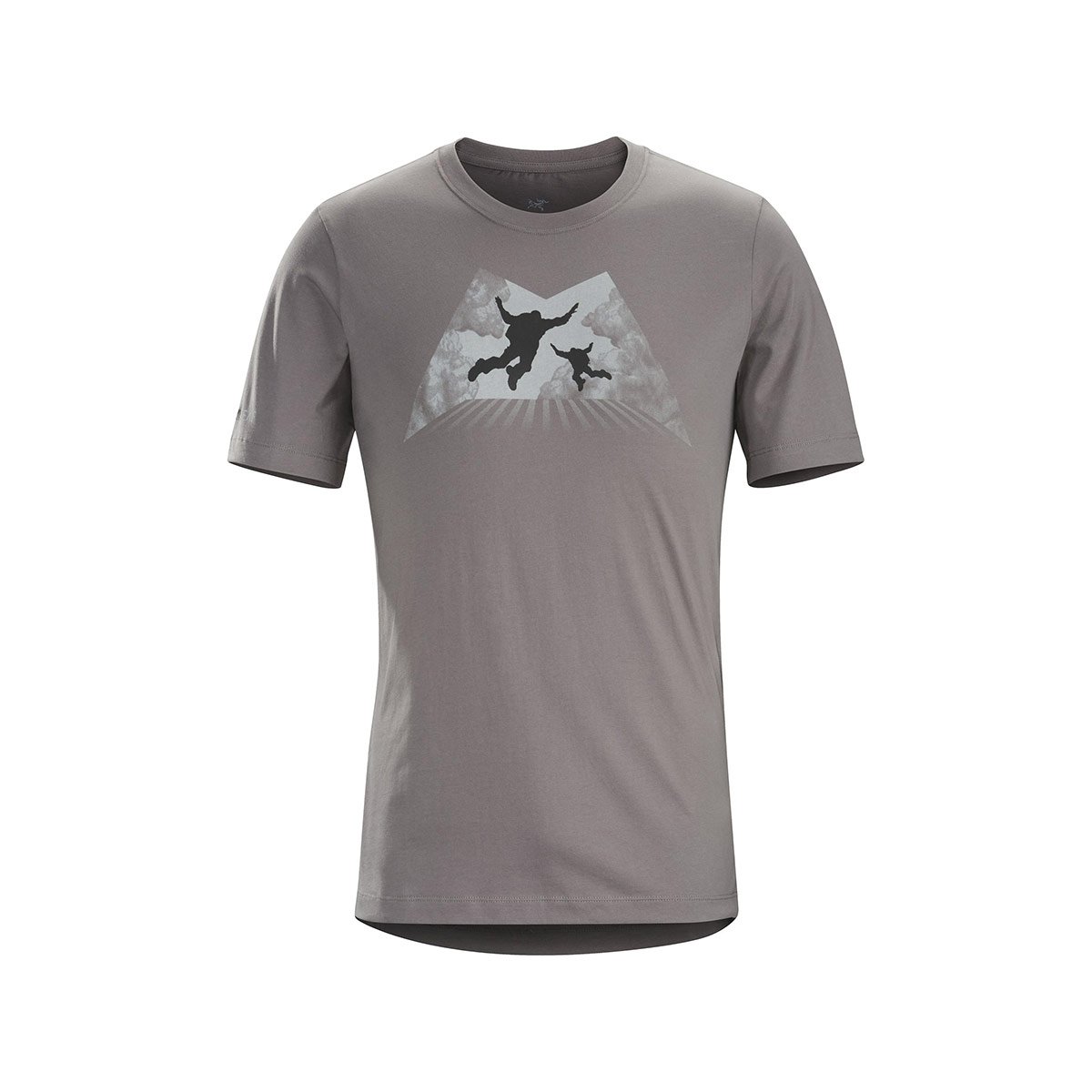 Tee shirt Arc'teryx LEAF gris Maverick avec le dessin représentant 2 chuteurs sautant par tranche arrière "Off The Ramp". Il est très léger et confortable à porter.